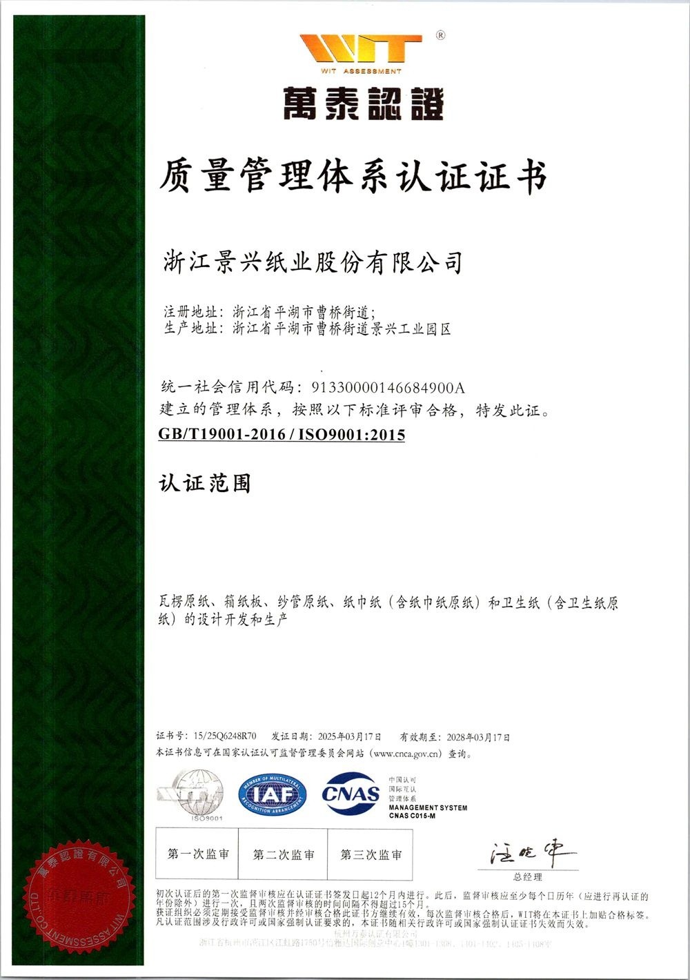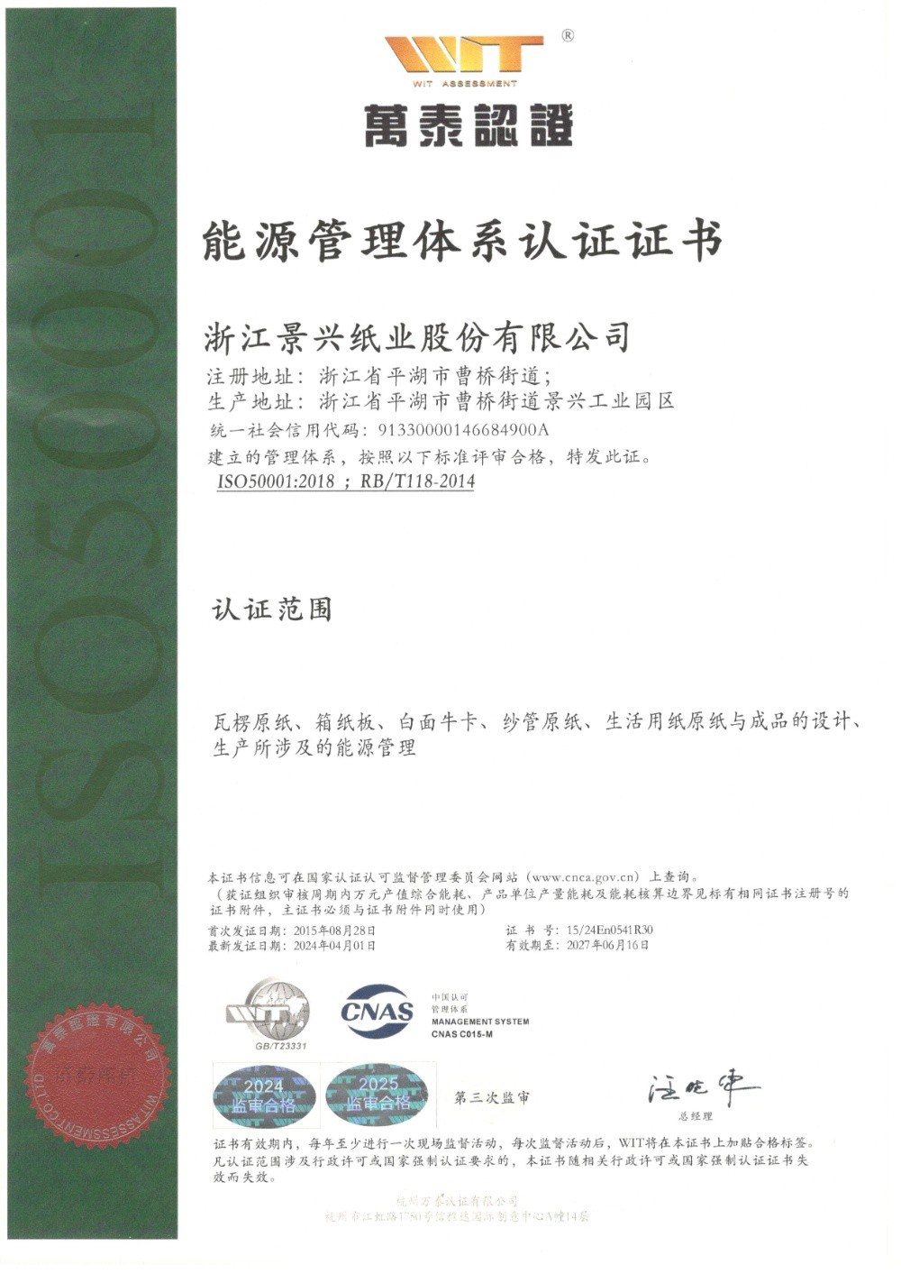 银河集团(galaxy)于1996年率先在同行业通过ISO9001质量管理体系认证,2002年通过ISO14001环境管理体系认证,2014年通过OHSAS18001职业健康安全管理体系认证,2015年通过GB/T23331能源管理体系和FSC®森林体系认证,2018年通过两化融合管理体系认证。